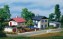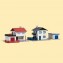 Zweigeschossige Einfamilienhäuser mit Garage. Tische und Bänke sowie Vorgartenzäune liegen bei.