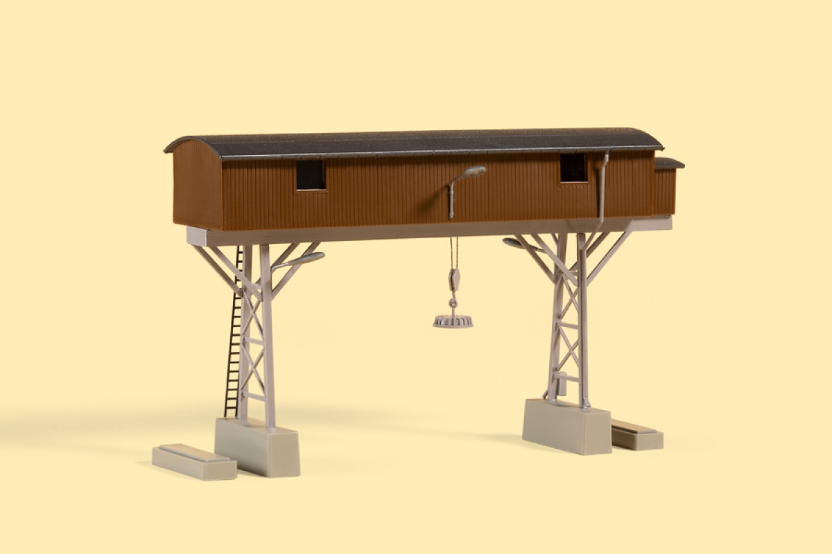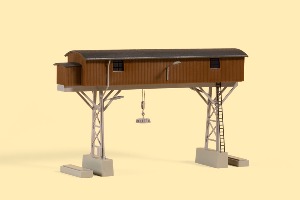 Mit einem Überladekran kann Ladegut von einem Waggon auf einen Lkw oder zwischen zwei Waggons umgeschlagen werden. Unser Modell hat eine stationäre Variante auf Betonsockeln zum Vorbild. Die Holzverkleidung dient als Wetterschutz für die Laufkatze, deren Haken wahlweise mit einem Schrottmagneten bestückt werden kann. Für Wartungsarbeiten gibt es eine Leiter aus stabilem Lasercut-Karton.