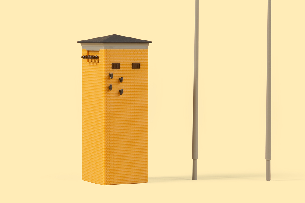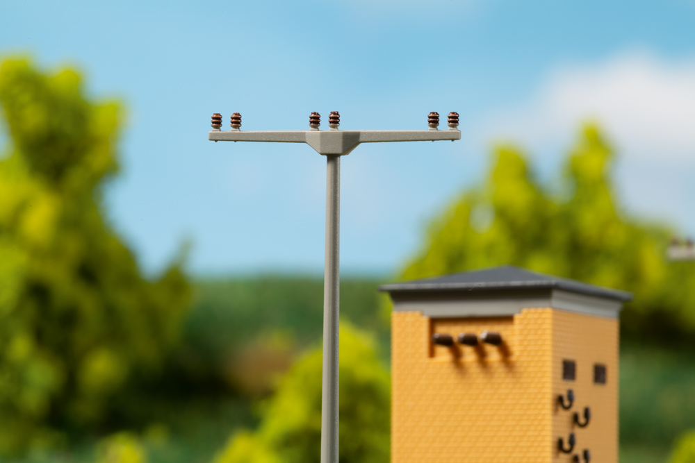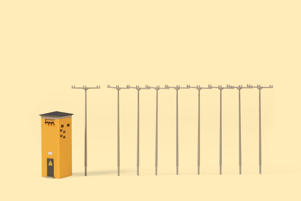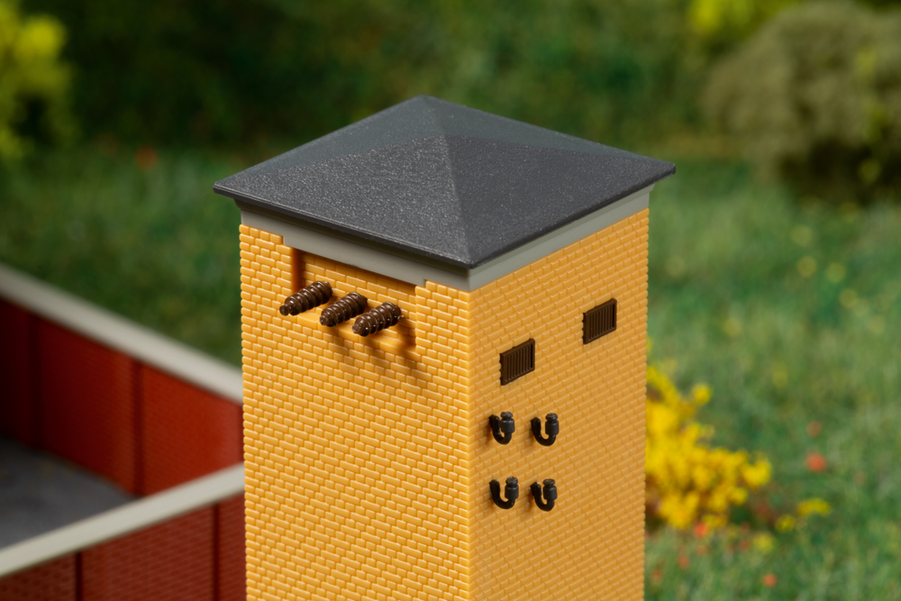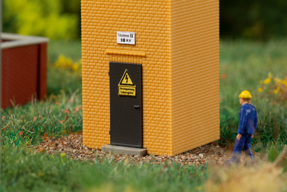 Transformatorenhäuschen - In landschaftstypischer Klinkerbauweise ist dieses Gebäude der Energieversorgung errichtet worden. Beim Vorbild im Inneren mit einem Transformator ausgeru?stet, dienten diese Anlagen zur Umwandlung der 10 kV des Mittelspannungsnetzes auf den Spannungswert von 230/400 V des Ortsnetzes. Der durch Raumzellenbauweise einfach zu montierende Bausatz wird durch 9 Mittelspannungsmasten Höhe 64 mm ergänzt.Originalmodell.17 x 19 x 51 mm