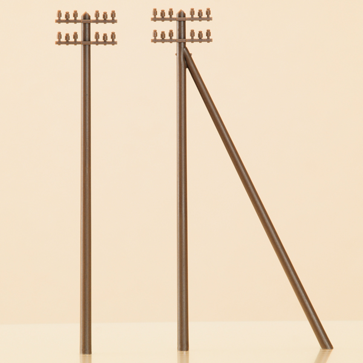 Bei der vorbildgerechten Gestaltung entlang der Strecke sollte man auf filigrane Telegrafenmasten nicht verzichten. Wenn die Isolatoren weiß und die Traversen schwarz bemalt werden, erreichen Sie Perfektion. Für die Bogen sind Masten mit Stütze vorgesehen. In regelmäßigen Abständen wird sogar mit 2 Stützen gesichert.