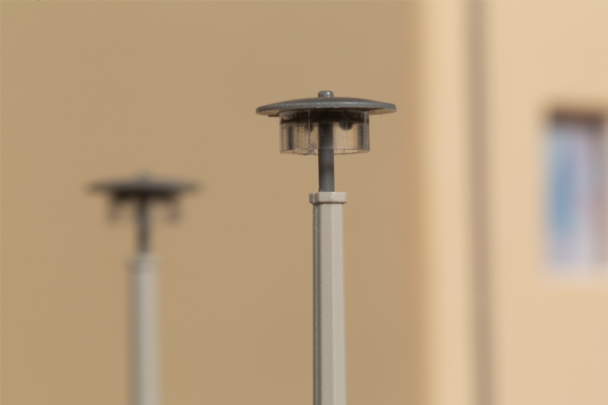 Attrappen. Diese Leuchten vom Typ RSL1 waren im DDR-Straßenbild seit den 1960er Jahren anzutreffen. Überwiegend auf einem Betonmast montiert, erhellen sie Straßen und Plätze auch heute noch in vielen Städten und Gemeinden. Scheiben aus gebogenem Strukturglas, die durch Metallbügel gehalten werden, gaben der Rundscheibenleuchte ihren Namen.