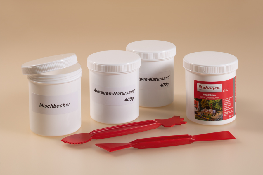 Die perfekte Ergänzung zu unseren Land-schaftsbauplatten Art. 78 300 und 78 301oder auch ein günstiges Set für den täglichen Mo-dellbau. Der Inhalt besteht aus verschiede-nen Materialien und Werkzeugen zur Gestal-tung von Landschaftselementen, wie Felsen, Hügeln, Tälern, Wegen und Straßen.Die selbst hergestellte Spachtelmasse zur Landschaftsgestaltung kann mit unseren Modellbaufarben abgetönt werden.Weißleim 250 mlNatursand 800 gMischbecher und Modellier-Werkzeug
