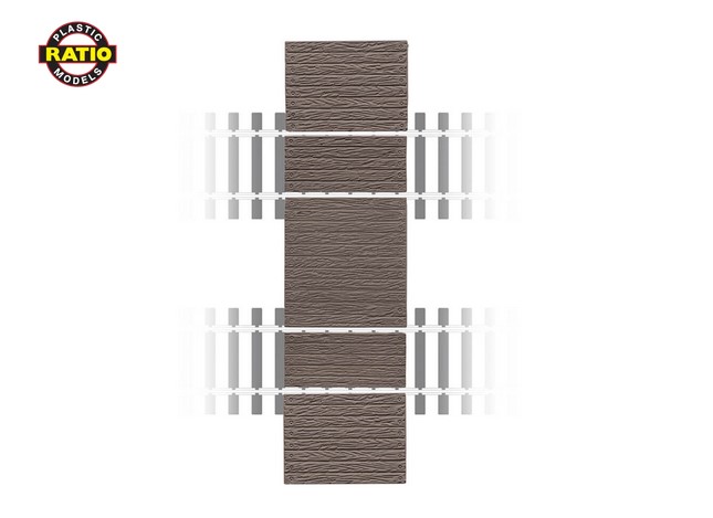 Am Fuß von Bahnsteigendrampen platziert, ermöglichen Schubkarrenübergänge das Übersetzen von leichten Gütern und Gepäckstücken über ein Doppelgleis auf einen benachbarten Bahnsteig durch das Bahnpersonal. Zur Fertigstellung des Modells werden Kleber und Farben benötigt.