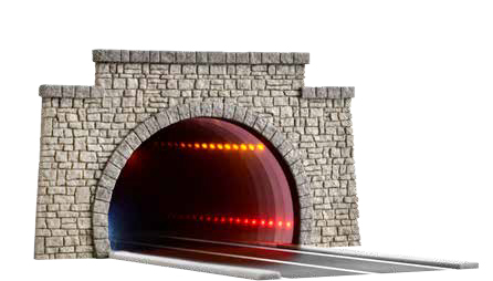 Dem Tunnel liegt ein Stück Vollmer Steinkunststraße bei. Länge: 18 cm. Das Tunnelportal ist aus Vollmer Steinkunst gefertigt. Maße: 16,7 x 9,7 x 2,2 cm.