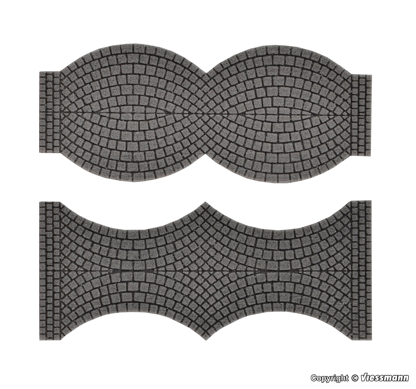 Straßenplatte Kopfsteinpflaster, je 2 Endstücke. Maße: B 8 cm x L 1,7 cm.