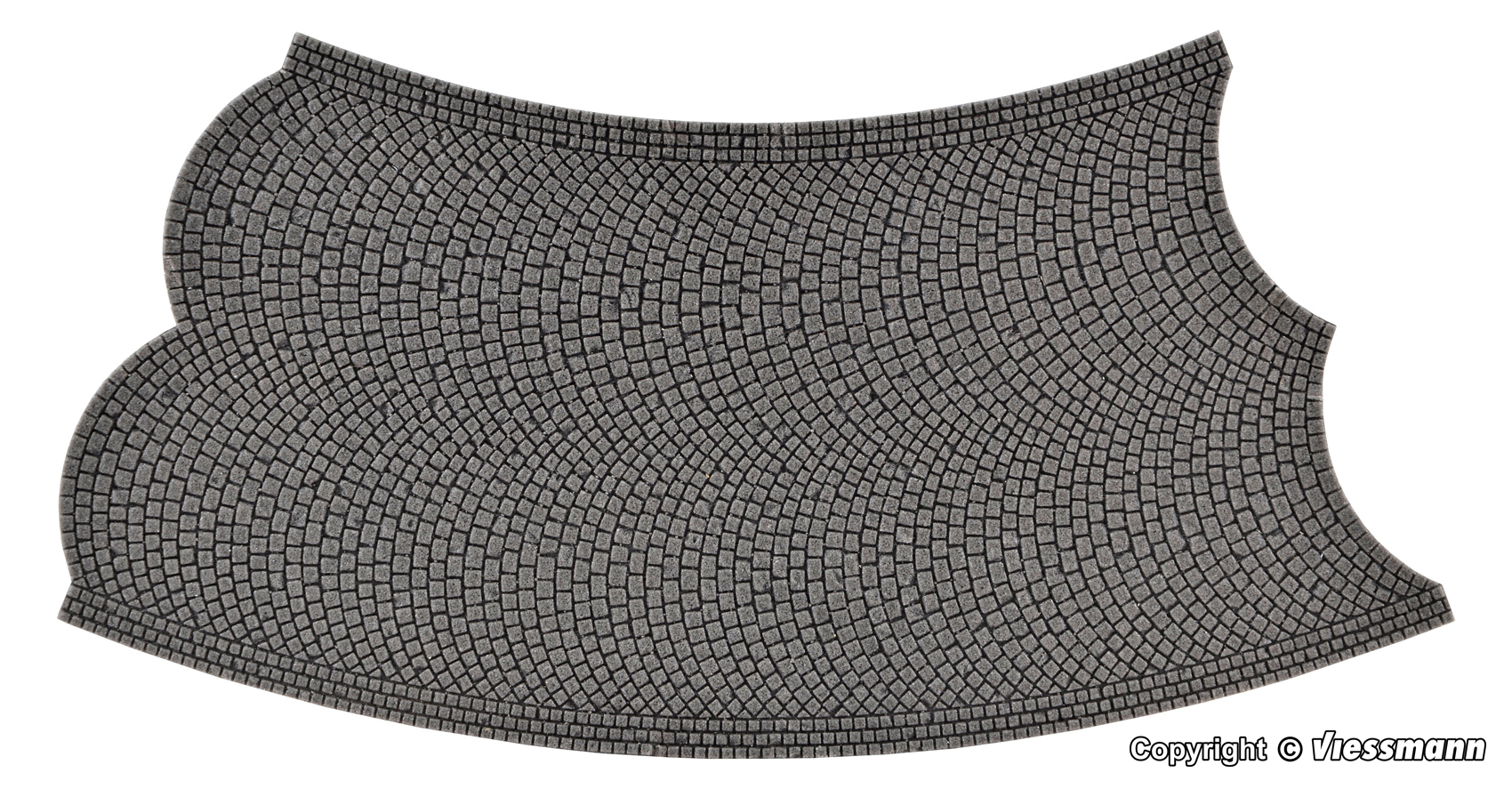 Straßenplatte Kopfsteinpflaster, 45°-Kurve Radius 15 cm. Die Straßenplatten aus der Steinkunst-Serie bestehen aus wetterfestem Sedimentverbundwerkstoff. Dieser Werkstoff erzeugt eine unübertroffen realistische Steinoberfläche. Die Platten sind flexibel und einfach mit einem Cutter-Messer zuschneidbar. Maße: L 23 x B 23 cm.