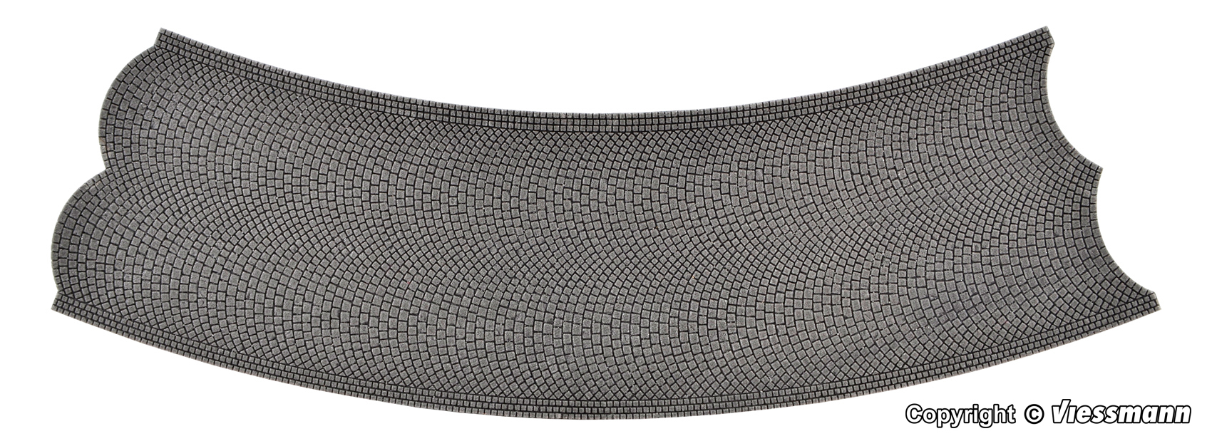 Straßenplatte Kopfsteinpflaster, 45°-Kurve, Radius 30 cm. Die Straßenplatten aus der Steinkunst-Serie bestehen aus wetterfestem Sedimentverbundwerkstoff. Dieser Werkstoff erzeugt eine unübertroffen realistische Steinoberfläche. Die Platten sind flexibel und einfach mit einem Cutter-Messer zuschneidbar. Maße: L 38 x B 38 cm.
