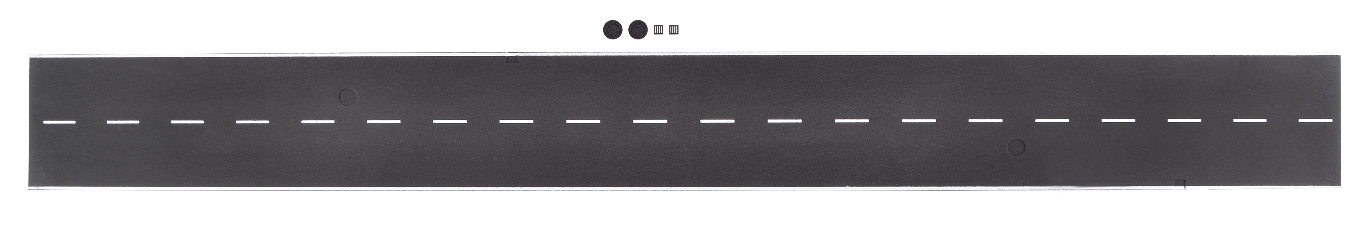 H0 Straßenplatte Asphalt aus Steinkunst mit Nut für Magnetband - Die Asphaltstraße aus der Steinkunst-Serie besteht aus wetterfestem Sedimentverbundwerkstoff. Dieser Werkstoff erzeugt eine unübertroffen realistische Asphaltoberfläche. Die Straße ist flexibel und einfach mit einem Cutter-Messer zuschneidbar. Die Straße ist an der Unterseite mit einer Nut für das CarMotion Magnetband, 0,5 mm, Art. 8429 ausgestattet. In der Straße befinden sich 2 Gullideckel und 2 Kanaldeckel. L 75 x B 8 cm