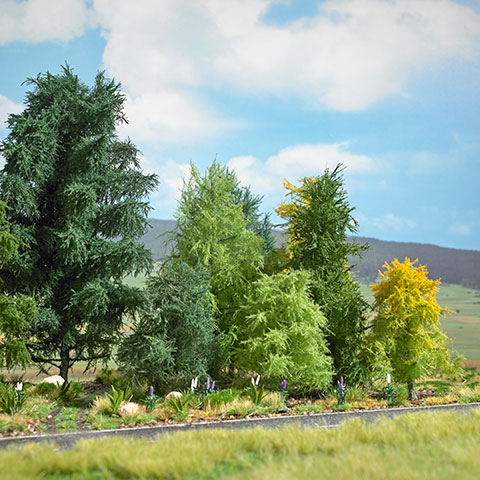 In aufwendiger Fertigung werden die super-feinen Nadeln in die Zweige und Äste der Nadelbäume eingearbeitet, so dass ein individuelles und absolut naturgetreues Nadelkleid für jeden einzelnen Baum entsteht. Diese Bäume harmonieren farblich perfekt mit den Busch Standardbäumen. Ein super schöner Wald entsteht z.B. durch die Einzelplatzierung von NATUR PUR Exklusiv Nadelbäumen am Waldrand, kombiniert mit den preiswerten Busch Nadelbäumen für die dichte Bewaldung dahinter.