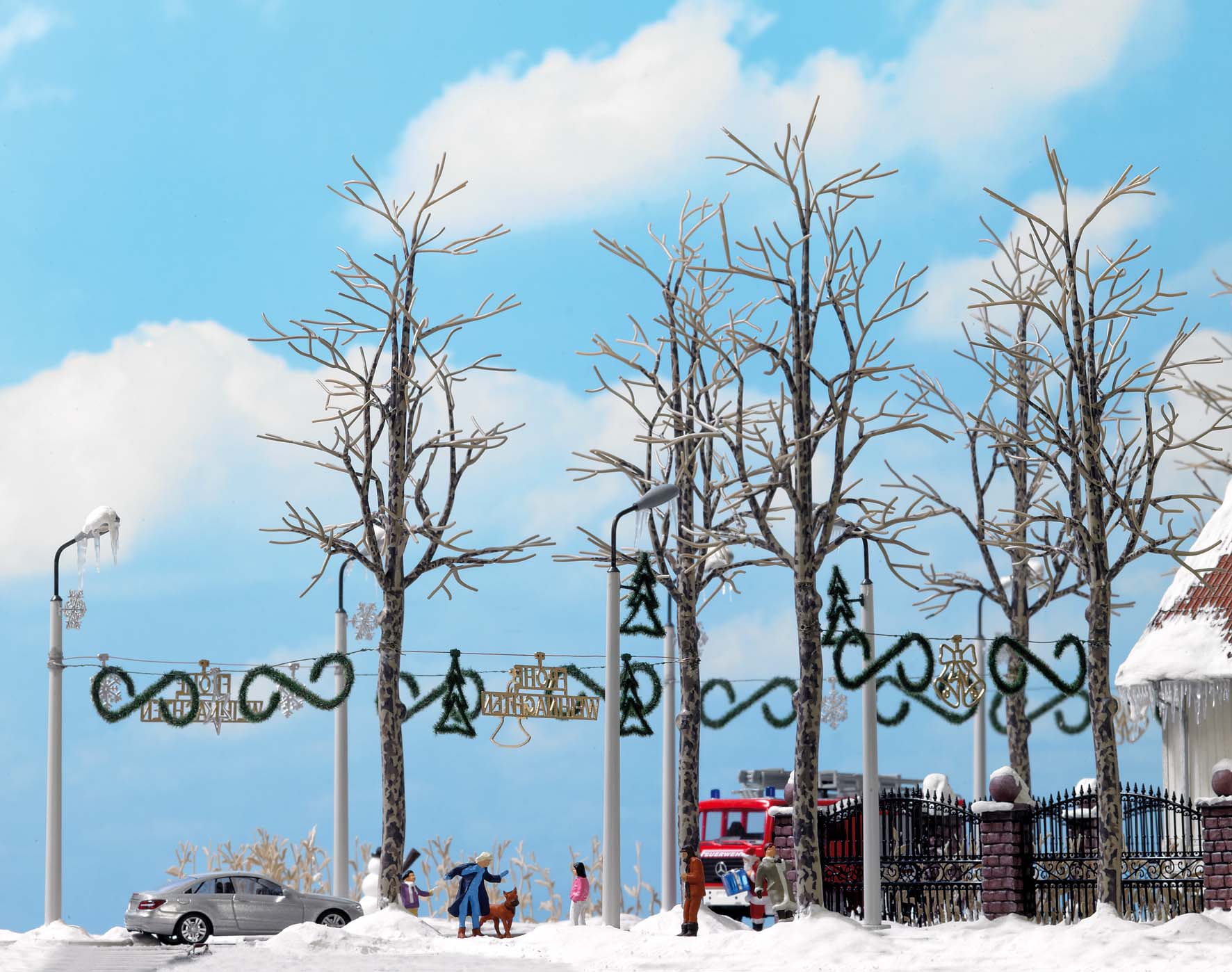 Bausatz für 4 winterliche Laubbäume, jeweils ca. 165 mm hoch. Die Stämme sind mehrfarbig unregelmäßig bedruckt, so dass sich eine natürliche Oberflächenstruktur ergibt. Perfekt zum Einschneien mit Busch Schneepulver 7170 bzw. 7171. Und alle, die es nicht so kalt mögen, können die Bäume auch als laublose Herbstbäume verwenden oder sie mit Busch Foliage 7346 herbstfarbig wirken lassen. Natürlich können sie auch mit Busch Belaubungsmaterial frühlingshaft (7311) oder sommerlich (7312) belaubt werden.