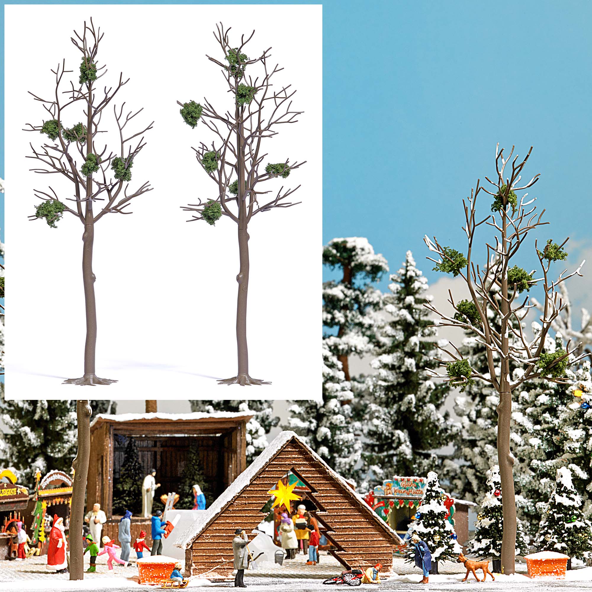 2 winterlich kahle Bäume mit Mistelbewuchs. Höhe jeweils 165 mm.