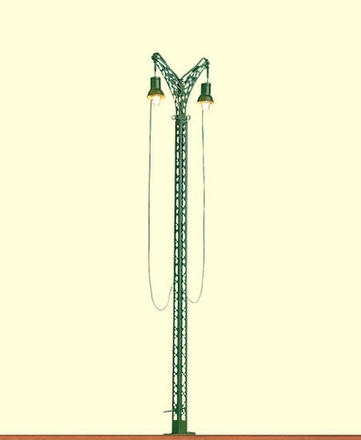 Gittermastleuchte 2-fach. Höhe 145 mm, tragende Teile aus Messing, filigrane Ätzteile, mehrteiliger Lampenkopf, aufwändige Lackierung in Handarbeit