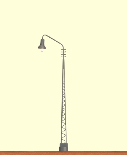 LED Gittermastleuchte, Stecksockel. Höhe 120 mm, einfaches Handling durch patentierte Stecksockeltechnik, aufwändige Kabelverbindungen zwischen Leuchte und Sockel entfallen, Ausrichtung um 10° um unebenes Gelände auszugleichen, elektrisch trennbar, untereinander kompatibel, tragende Teile aus Messing, filigrane Ätzteile, mehrteiliger Lampenkopf, aufwändige Lackierung in Handarbeit