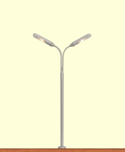 LED Peitschenleuchte, doppelt, Stecksockel. Höhe 115 mm, einfaches Handling durch patentierte Stecksockeltechnik, aufwändige Kabelverbindungen zwischen Leuchte und Sockel entfallen, Ausrichtung um 10° um unebenes Gelände auszugleichen, elektrisch trennbar, untereinander kompatibel, tragende Teile aus Messing, filigrane Ätzteile, mehrteiliger Lampenkopf, aufwändige Lackierung in Handarbeit