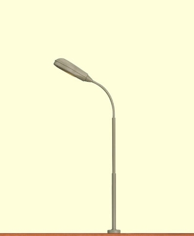 Peitschenleuchte, Stecksockel. Höhe 105 mm, einfaches Handling durch patentierte Stecksockeltechnik, aufwändige Kabelverbindungen zwischen Leuchte und Sockel entfallen, Ausrichtung um 10° um unebenes Gelände auszugleichen, elektrisch trennbar, untereinander kompatibel, tragende Teile aus Messing, filigrane Ätzteile, mehrteiliger Lampenkopf, aufwändige Lackierung in Handarbeit