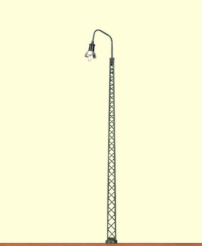 Gittermastleuchte, Stecksockel. Schlanker Vierkantmast, Höhe 140 mm, einfaches Handling durch patentierte Stecksockeltechnik, aufwändige Kabelverbindungen zwischen Leuchte und Sockel entfallen, Ausrichtung um 10° um unebenes Gelände auszugleichen, elektrisch trennbar, untereinander kompatibel, tragende Teile aus Messing, filigrane Ätzteile, mehrteiliger Lampenkopf, aufwändige Lackierung in Handarbeit