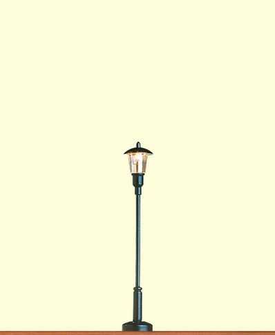 Straßenleuchte, Stecksockel. Höhe 60 mm, einfaches Handling durch patentierte Stecksockeltechnik, aufwändige Kabelverbindungen zwischen Leuchte und Sockel entfallen, Ausrichtung um 10° um unebenes Gelände auszugleichen, elektrisch trennbar, untereinander kompatibel, tragende Teile aus Messing, filigrane Ätzteile, mehrteiliger Lampenkopf, aufwändige Lackierung in Handarbeit