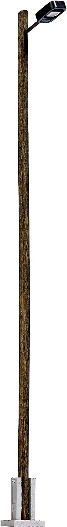 Universell einsetzbare Bahnhofsleuchte mit Mast aus echtem Holz. Auch für Industriegelände geeignet. Nachbildung der Betoneinfassung am Fuß der Lampe.