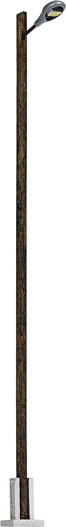 Universell einsetzbare Bahnhofsleuchte mit Mast aus echtem Holz. Auch für Industriegelände geeignet. Nachbildung der Betoneinfassung am Fuß der Lampe.