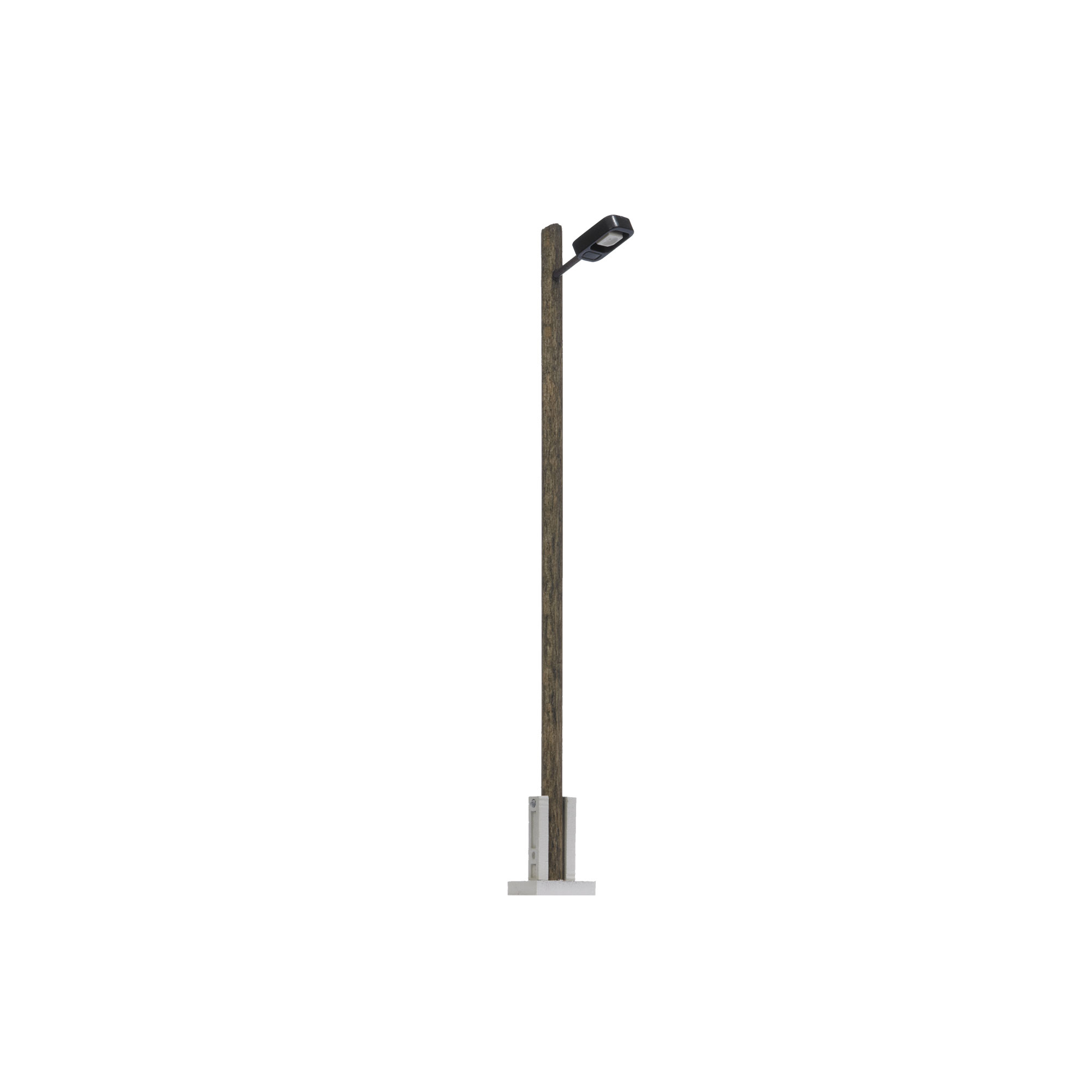 Universell einsetzbare Straßenleuchte mit Mast aus echtem Holz. Auch für den Bahnhofsbereich und Industriegelände geeignet. Nachbildung der Betoneinfassung am Fuß der Lampe. Lampenausleger mit vorbildgerecht weiß leuchtenden Neon-LEDs. Fertigmodell. Höhe 90 mm.