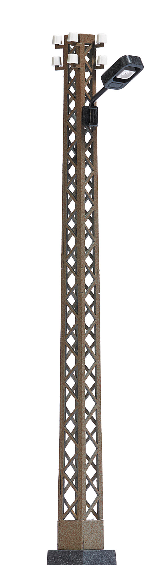 Realistische Nachbildung des gelb/orangenen Lichtes, das im Original durch Natriumdampflampen erzeugt wurde, durch gelb/orangene LEDs. Der Gittermast kann mit weiteren Leuchtkörpern aus dem Set H0 4132 bestückt werden. Höhe: 105 mm.