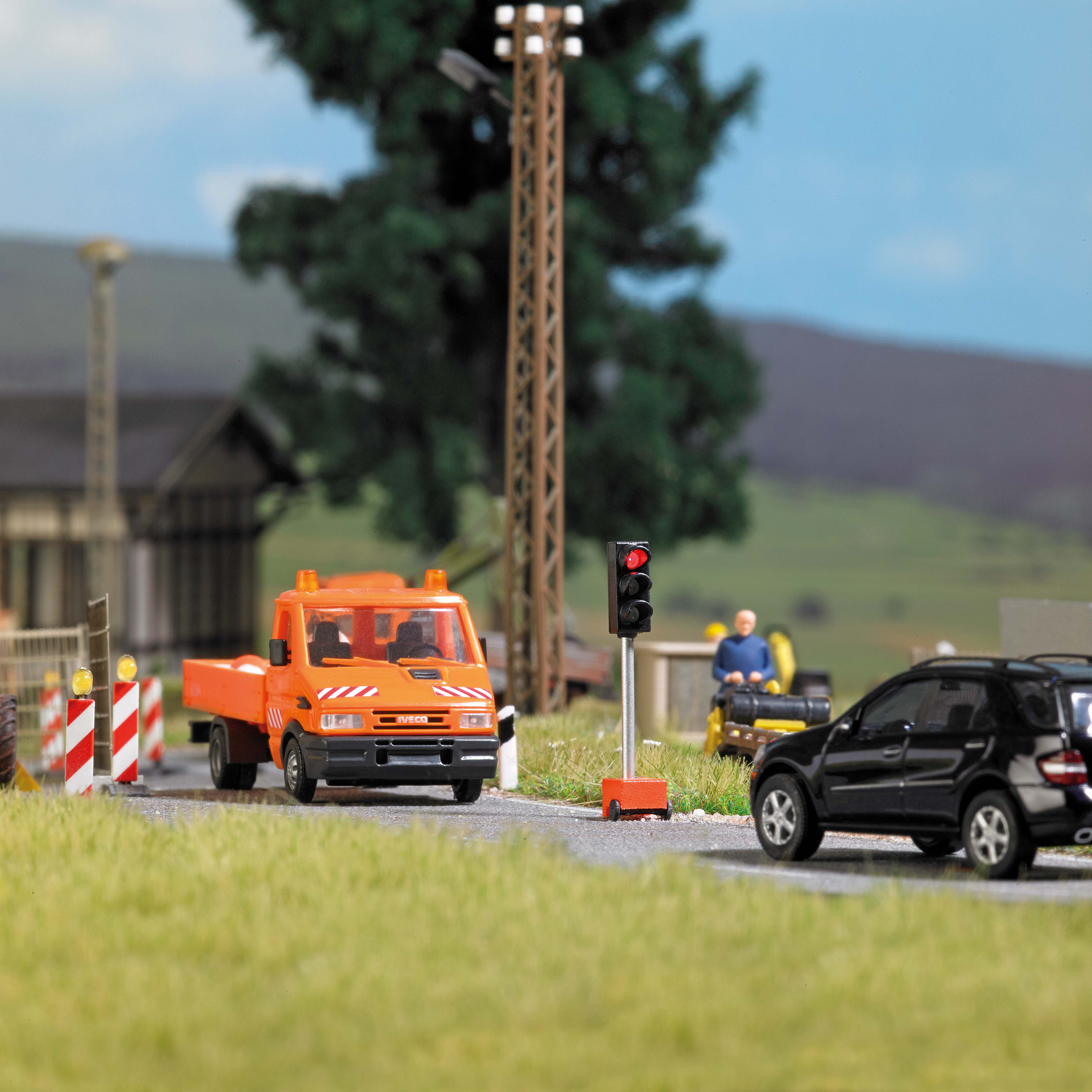 Zwei Baustellenampeln mit Leuchtdioden in Grün, Gelb und Rot. Dauerbetrieb, manuelle Schaltung mit Schalter oder realistische Automatiksteuerung in Verbindung mit Busch Lichtsteuermodul 5748 (nicht enthalten).