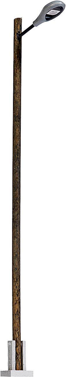 Universell einsetzbare Bahnhofsleuchte mit Mast aus echtem Holz. Auch für Industriegelände geeignet. Nachbildung der Betoneinfassung am Fuß der Lampe.