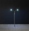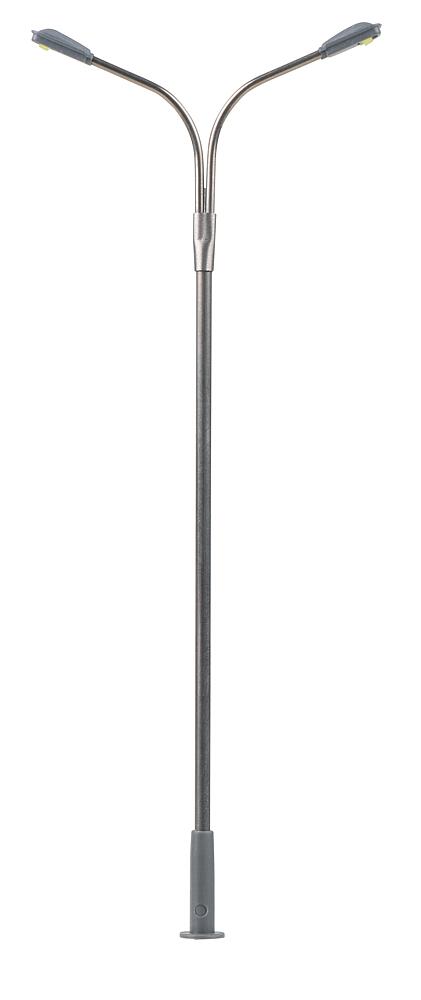 Moderne Peitschenleuchte mit zwei Auslegern. Besonders geeignet zur Ausgestaltung von Stadt-, Straßen- und Industrieszenerien. Der Mast ist aus Metall gefertigt und die Leuchtenhöhe variabel einstellbar. Die filigrane zweiflammige Leuchte ist mit langlebiger LED-Technik ausgestattet. Höhe: 100 mm.