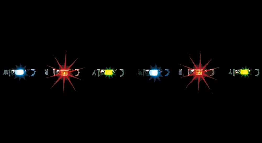 30 LEDs, in bunter Farbenfolge. Anschlussfertig 12-16 V, Gleich-/Wechselspannung. Länge: ca. 250 mm. Mit den beidseitigen Kupferlackdraht-Anschlüssen ist dazwischen eine Kürzung oder Teilung möglich. Ideal für die Ausleuchtung von Kirmesbuden, Schiffen, Biergärten etc. Für einen flackerfreien Betrieb bei Wechselspannung benötigen Sie den Gleichrichter 180633.
