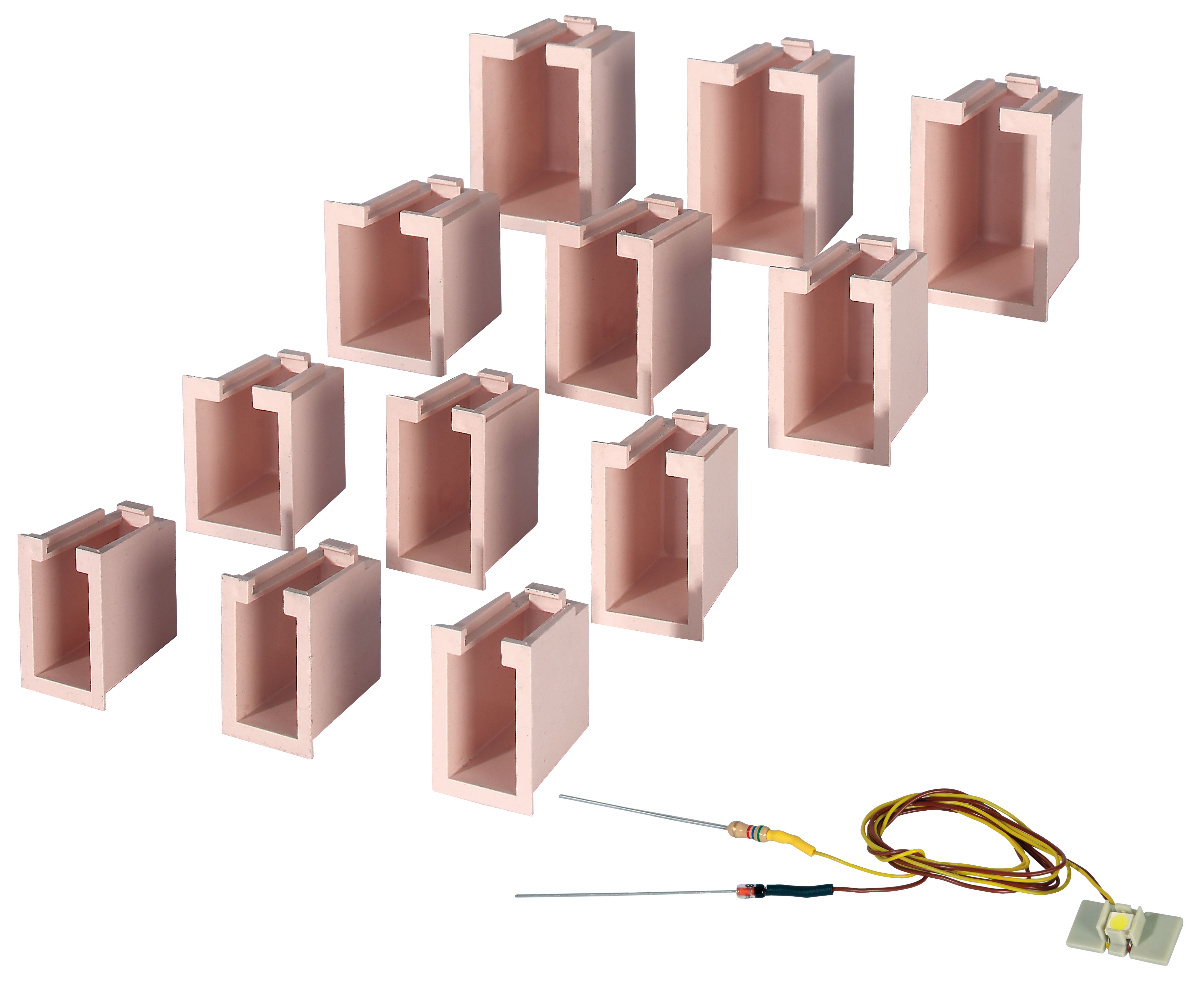 Das Set besteht aus 12 Lichtboxen ? je 3 Stück in 4 verschiedenen Größen ? und einer weißen Hausbeleuchtungs-LED. Die Lichtboxen zur indirekten Fensterbeleuchtung ermöglichen eine völlig neuartige Einzelbeleuchtung von Räumen. Zur Beleuchtung der Lichtboxen empfehlen wir die LEDs mit Anschlusskabel in gelb Art. 6047, weiß Art. 6048 und warmweiß Art. 6046, die Platinen mit einer LED in gelb Art. 6007, weiß Art. 6008, warmweiß Art. 6006, die Platinen mit je zwei LEDs in gelb Art. 6018, weiß Art. 6017 und warmweiß Art. 6021, oder die LED mit TV-Simulation Art. 5079. Die Lichtboxen werden von innen hinter die Fenster geklebt und geben dem Raum Tiefe. Auf diese Weise wird das Durchleuchten der Wände verhindert. Auch für TT und N Gebäude geeignet. Maße der Lichtboxen: L 1,7 x B 1,8 x H 2,6 cm, L 1,7 x B 1,6 x H 2,1 cm,