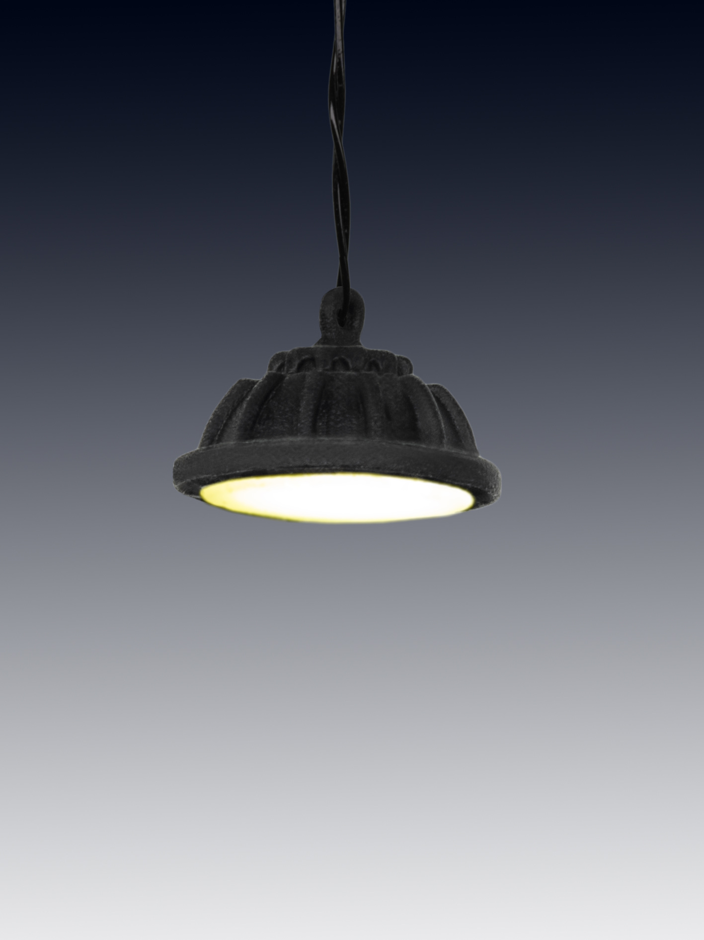 H0 Hängende Industrieleuchte modern, LED weiß - Wartungsfrei dank LED-Beleuchtung. Zur Deckenmontage. Passt perfekt zum kibri Art. 39250, Lager-/ Industriehalle, modern. Ø 0,7 x H 0,4 cm.