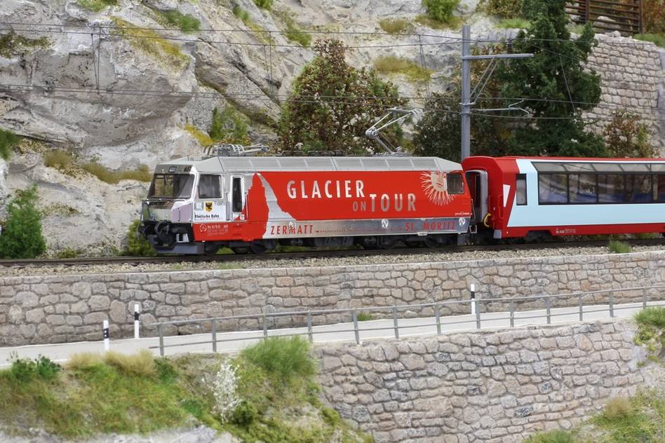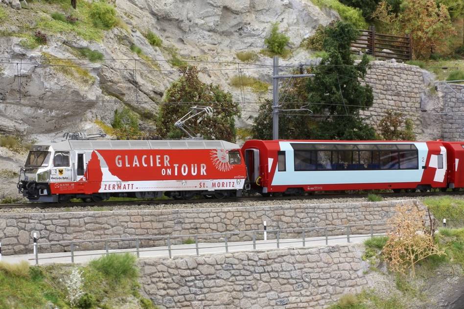 Neuauflage der Chromlok Ge 4/4 III 651 "GLACIER ON TOUR" - DCC digital mit SOUND. Mit LED Beleuchtung, Schlusslicht hinten rechts, angepassten Bremsschläuchen sowie ohne Jubiläumslogo "75 Jahre".