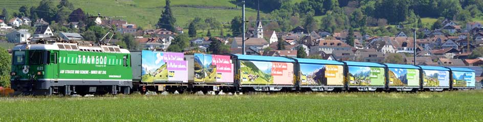 Der Verband Ostschweizerischer Landwirtscha flicher Genossenscha ft "Volg" gestaltete 2017 zwei von ihm genutzte Container sowie sechs Schiebewandwagen mit auffallenden Sujets Bündner Dörfer. Zur neuen Werbeoffensive gehört auch eine Werbelok des Logistikpartners "Traveco", der die Weiterverteilung der Lebensmittel übernimmt.