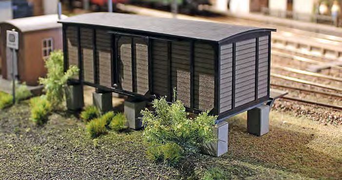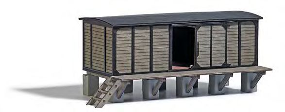 Ausrangierter Güterwaggon als Schuppen für Garten, Hinterhof, Hafenszenen, Bahngelände, Bahnmuseen usw. Die Beplankung der Wände ist originalgetreu in echtem Holz ausgeführt. Das Holzschiebetor ist in geöffnetem und geschlossenem Zustand montierbar (Öffnung 33 x 40 mm). Mit Rampe und seitlichem Treppenaufgang. Bausatz. Größe: 161 x 88 mm, 78 mm.