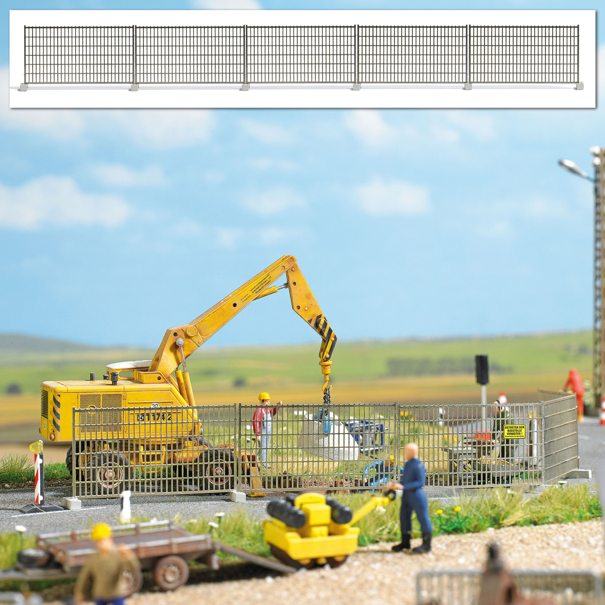 Filigraner Metall-Bauzaun. 5 Elemente jeweils 40 mm breit und 23 mm hoch. Mit 10 Betonfüßen.