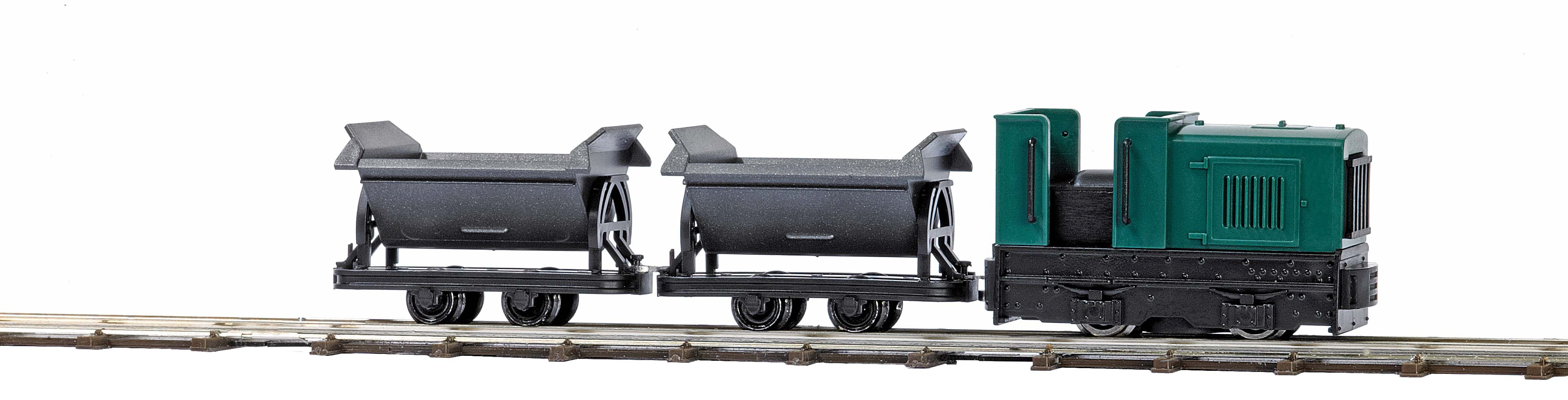 Feldbahnlokomotive Gmeinder 15/18 PS in offener Ausführung mit 2 Kipploren, 8 Bogengleise Radius 115 mm, 1 gerades Gleis und 1 Anschlussgleis je 133,2 mm. Inkl. Batteriekasten mit Schalter (Vorwärts/Rückwärts/Stopp).