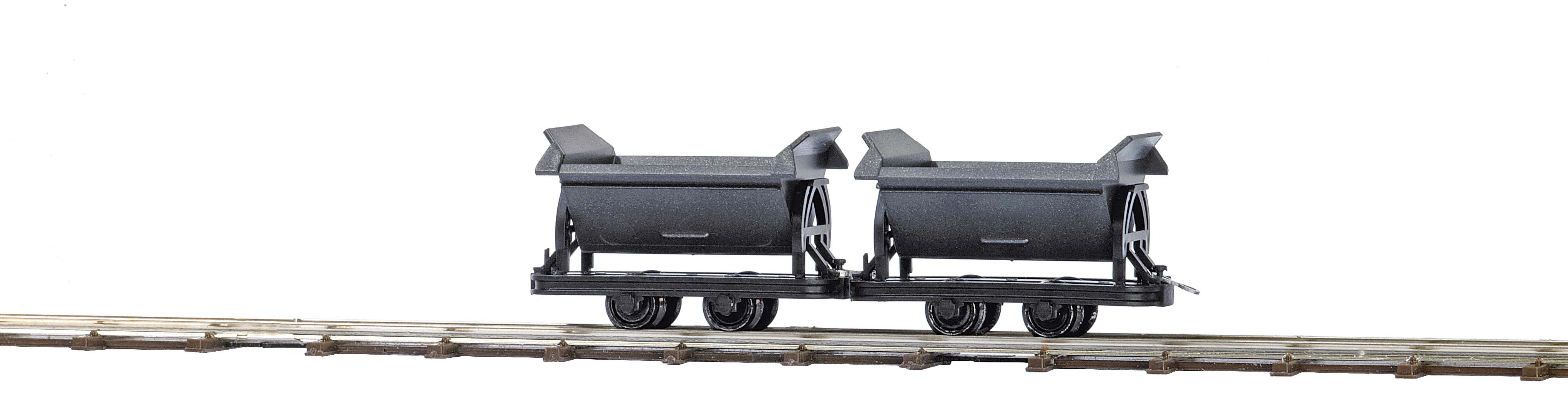 2 Muldenkipper für den Einsatz auf Feldbahnen nach einem Vorbild von O&K (Baujahr 1936, 1,5 cbm Inhalt). Die Mulden des Modells sind kippbar. Länge je Wagen: ca. 29 mm.