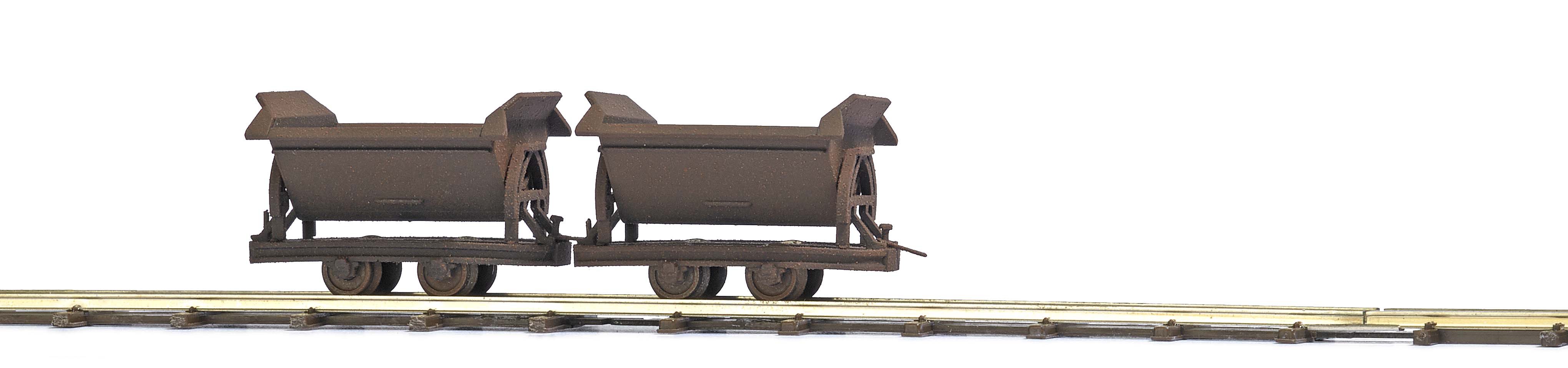 Zwei verrostete Kipploren. Professionell im Rost-Look gealtert. Länge je Wagen: 29 mm.