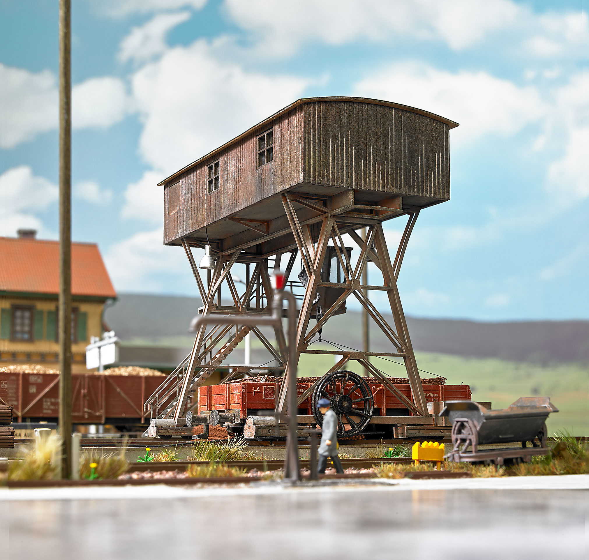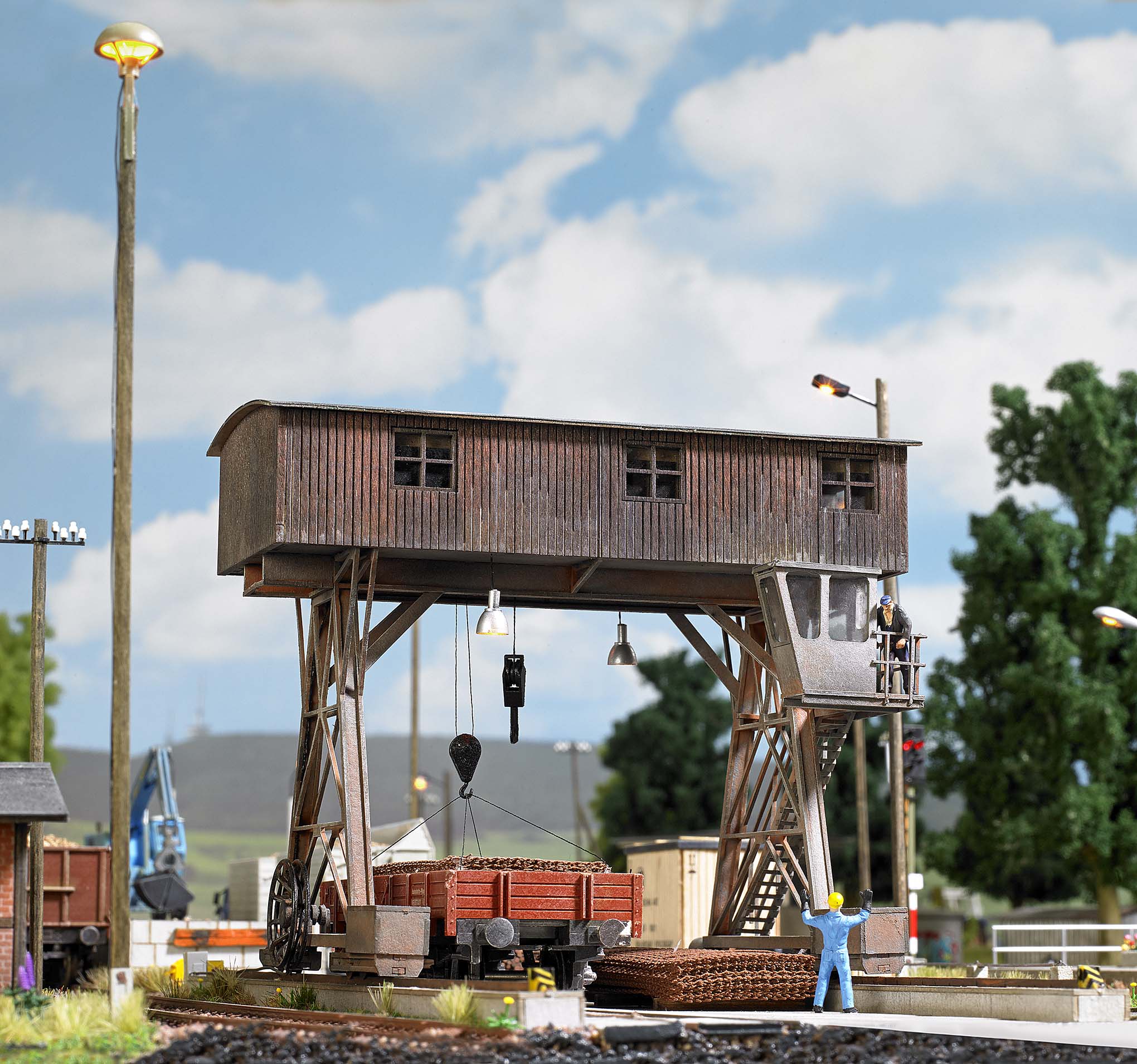 Bausatz eines Portalkranes nach einem Vorbild im sächsischen Zwickau. Der Aufbau-tails wie Sprossenfenster, Treppenaufgang, Rolle für Elektrokabel und zwei Kranhaken.