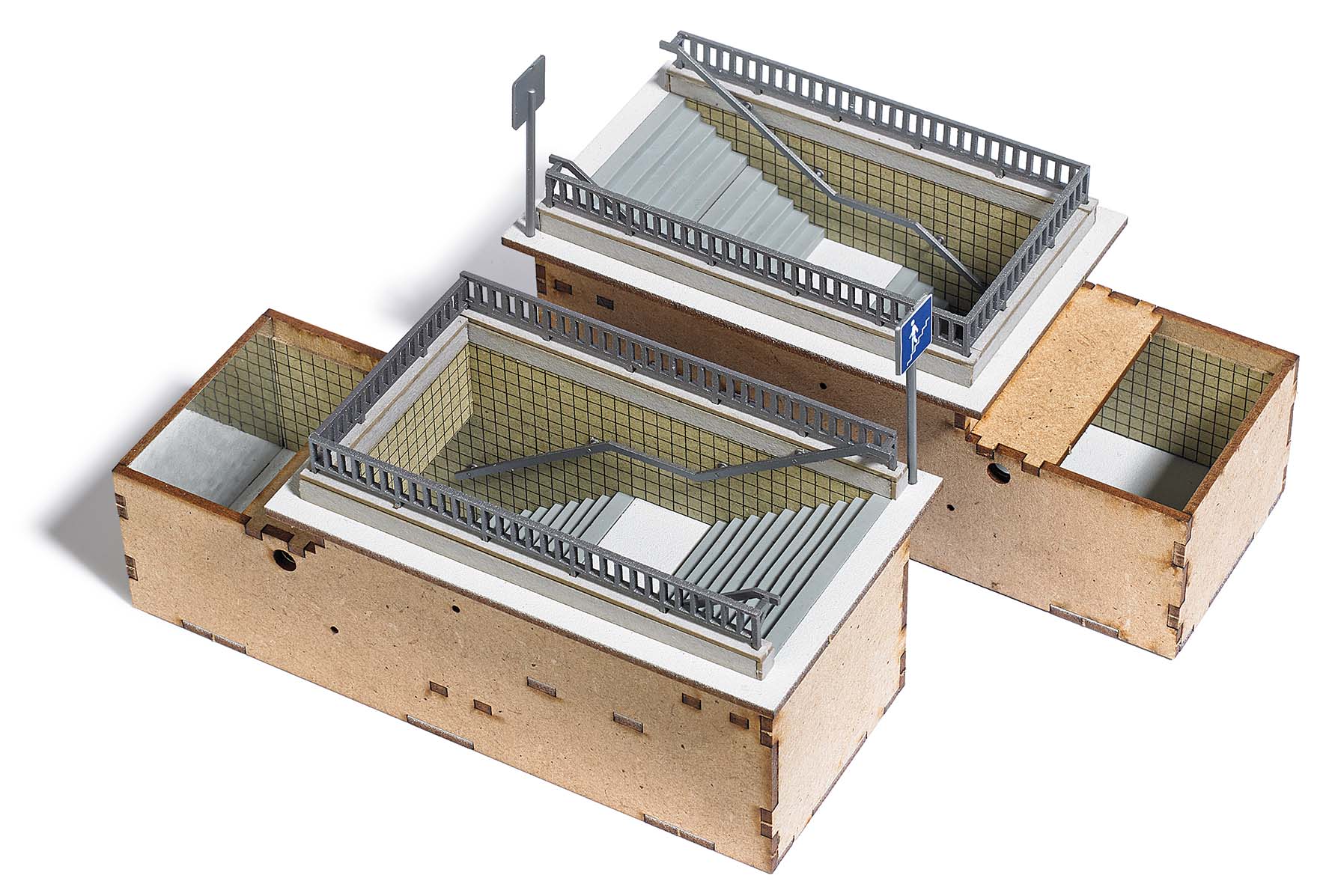 Bausatz für 2 Fußgängerunterführungen. Mit rundum laufendem Geländer und Hinweisschild auf der Straßenebene. Treppenabgang mit Treppenabsatz, Handläufen und Nachbildung der gefliesten Wände. Optische Verlängerung des Durchganges durch Spiegel im Untergeschoss. Beleuchtbar mit LED Beleuchtungs-Set 5998.