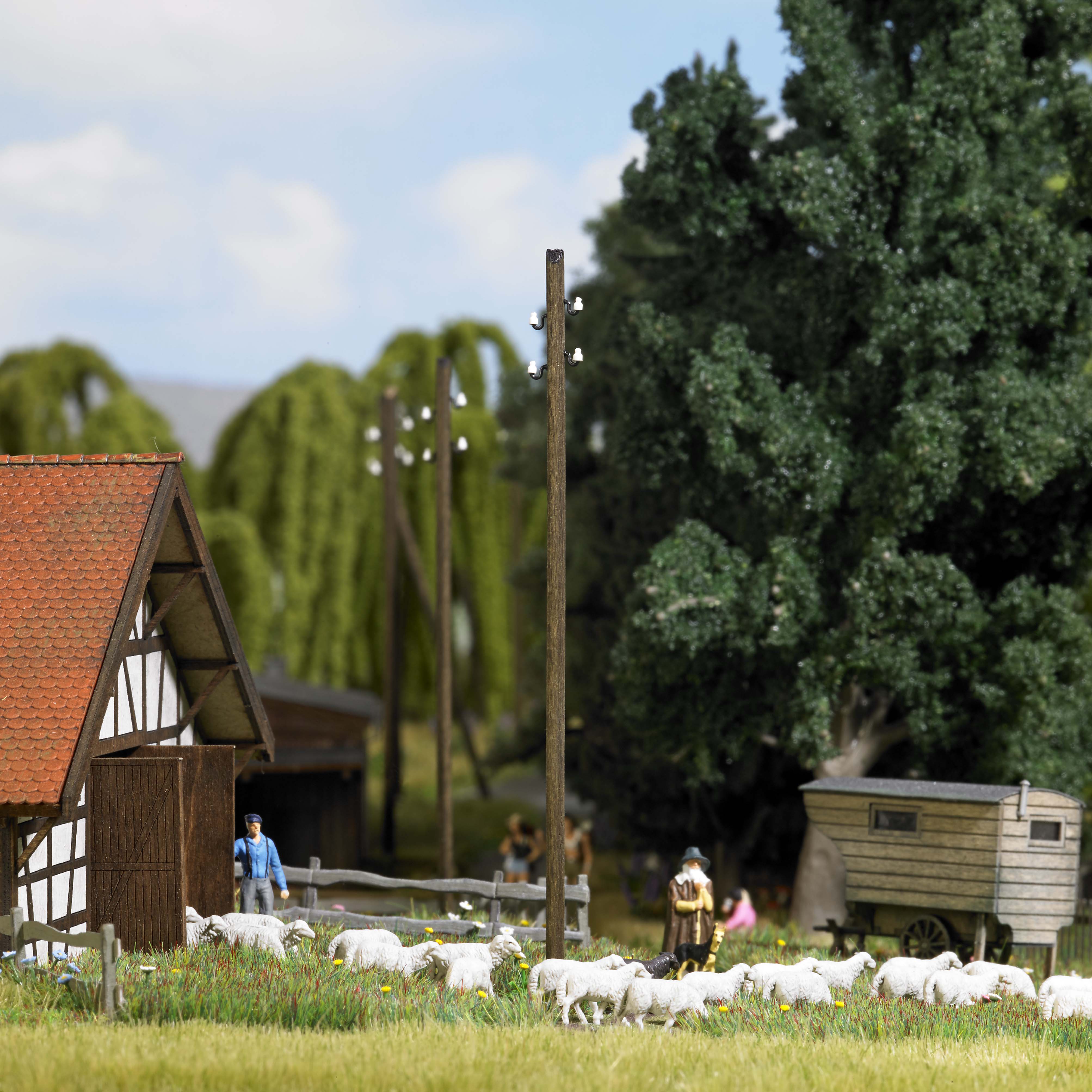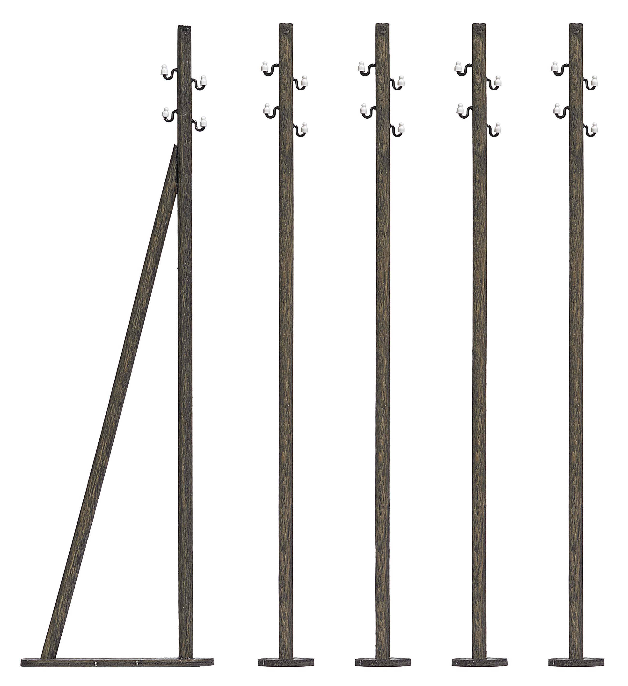 Bausatz für 5 Freileitungsmasten aus Echtholz mit filigranen Isolatoren. 4 Masten gerade, 1 Mast mit Seitenausleger. Maße: 107 mm.