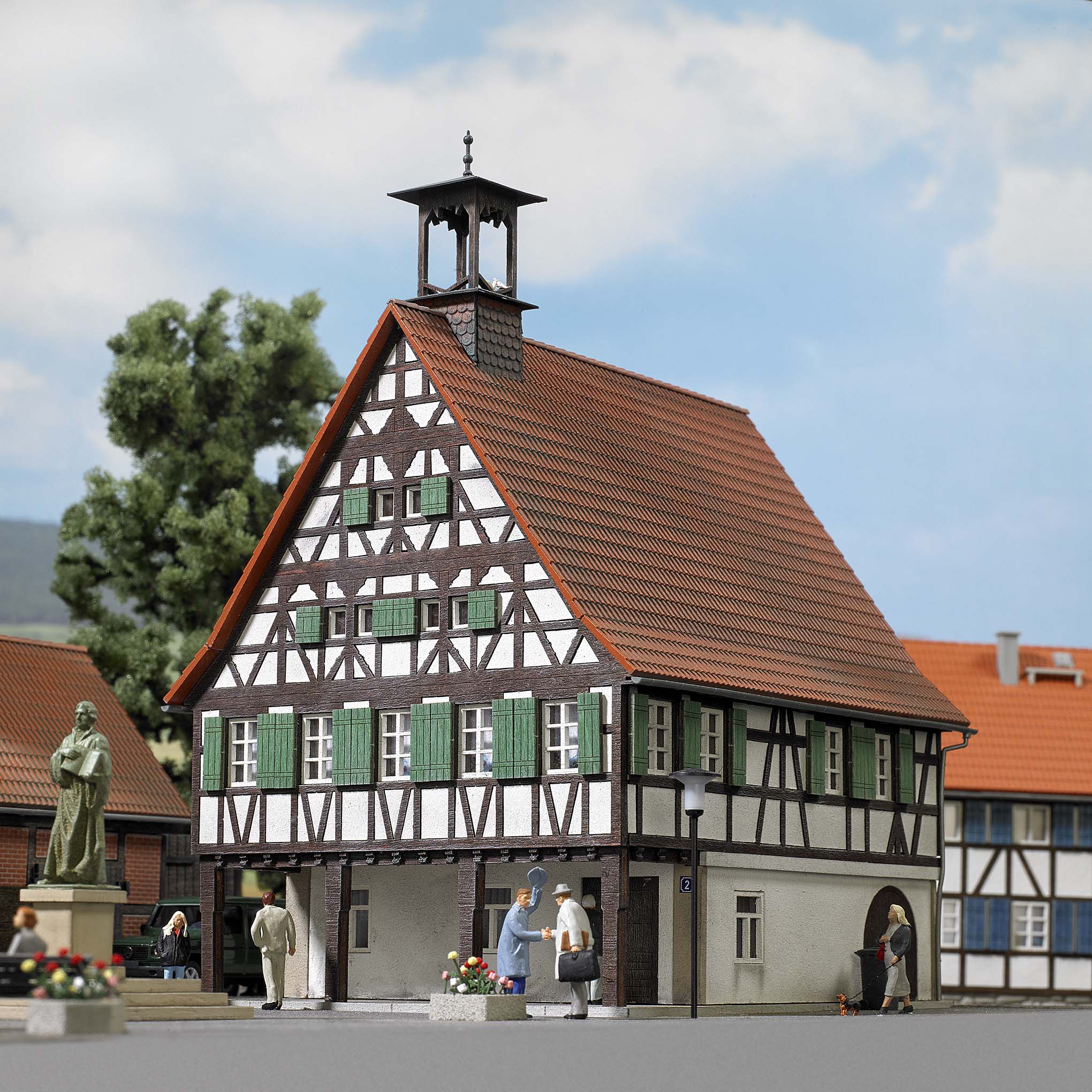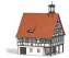 Bausatz eines romantischen Fachwerkgebäudes nach dem Vorbild des historischen Rathauses Uhlbach bei Stuttgart. Die vielen Details des über vierhundert Jahre alten Originals wie Rathausturm und Dachgaube werden im Modell hervorragend wiedergegeben. Die massiven Säulen des Arkadengangs wie Fachwerk, Türen, Tore und die Klappläden sind aus echtem Holz gefertigt und bereits fertig koloriert. Passende Ausschneidemotive enthalten. Vorbereitet zum Einbau einer Innenbeleuchtung.