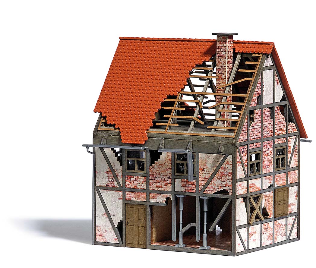 Diese Modell zeigt super-realistisch den Zerfall eines typischen Fachwerkhauses und entspricht von der Größe dem neuen Fachwerkhaus H0 1666 von Busch. Das Gemäuer ist zum Teil herausgebrochen und das verbliebene Fachwerk mit Stahlsprießen abgestützt. Die Fensterscheiben sind zum Teil eingeschlagen. Unter dem bröckelnden Putz kommt das Mauerwerk zum Vorschein. Durch das demolierte Dach ist das defekte Gebälk, der hölzerne Dachboden und der gemauerte Kamin zu sehen. Zerstörte Fenster sind mit Balken und Klappläden gesichert. Herunterhängende Dachrinnenreste. Nachbildung des Steinbodens im Erdgeschoss. Alle Teile fertig koloriert. Zusätzlich enthalten: Beutel mit »Schutt« zur Dekoration. Bausatz.