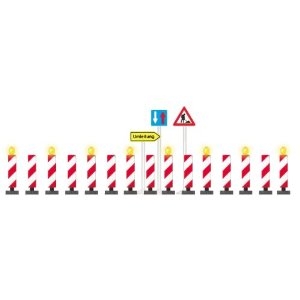 Komplett-Set: 15 Warnbaken (davon 8 mit Blitz), diverse Verkehrszeichen und Schaltung (umschaltbar auf wandernde Blitzfolge oder nacheinander aufleuchtende und gemeinsam verlöschende Leuchtfolge).