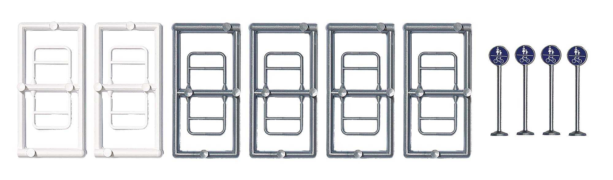 4 weiße Fahrradweg-Absperrungen zum selbst Bemalen und 8 graue Absperrungen als Fahrradständer. Mit 4 Verkehrsschildern für Fuß- und Radwege