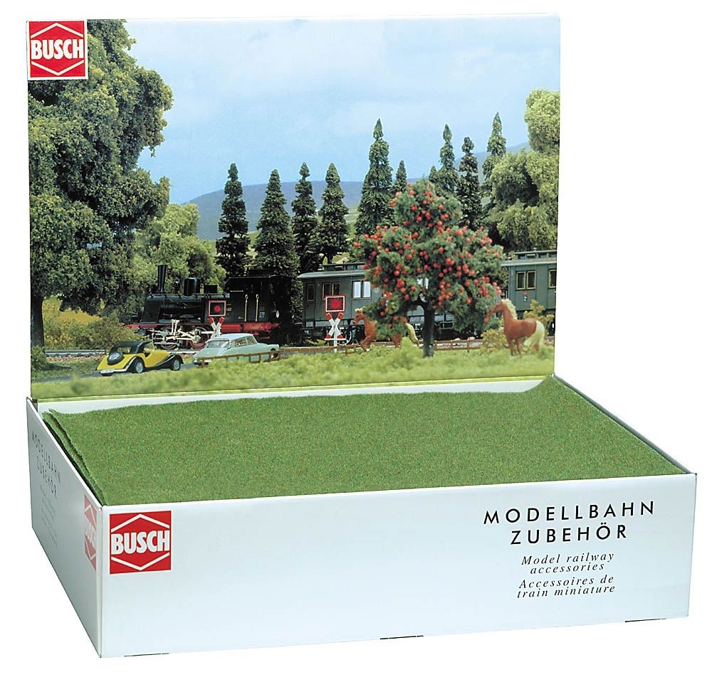 Besonders dicht beflockt. Durch Spezialpapier sehr strapazierfähig und leicht zu verarbeiten. Extra lichtbeständige Flocken. Werden Busch Gelände-Teppiche auf ebener Fläche verlegt, ist Busch Modellbau-Haftkleber 7598 für eine faltenfreie Anbringung empfehlenswert. Durch Verwendung von Weißleim (z.B. Busch 7599) wird das Spezialpapier weich und anschmiegsam. Entsprechende Abschnitte passen sich auch unregelmäßigen Untergründen, wie Berg- oder Felspartien, an.