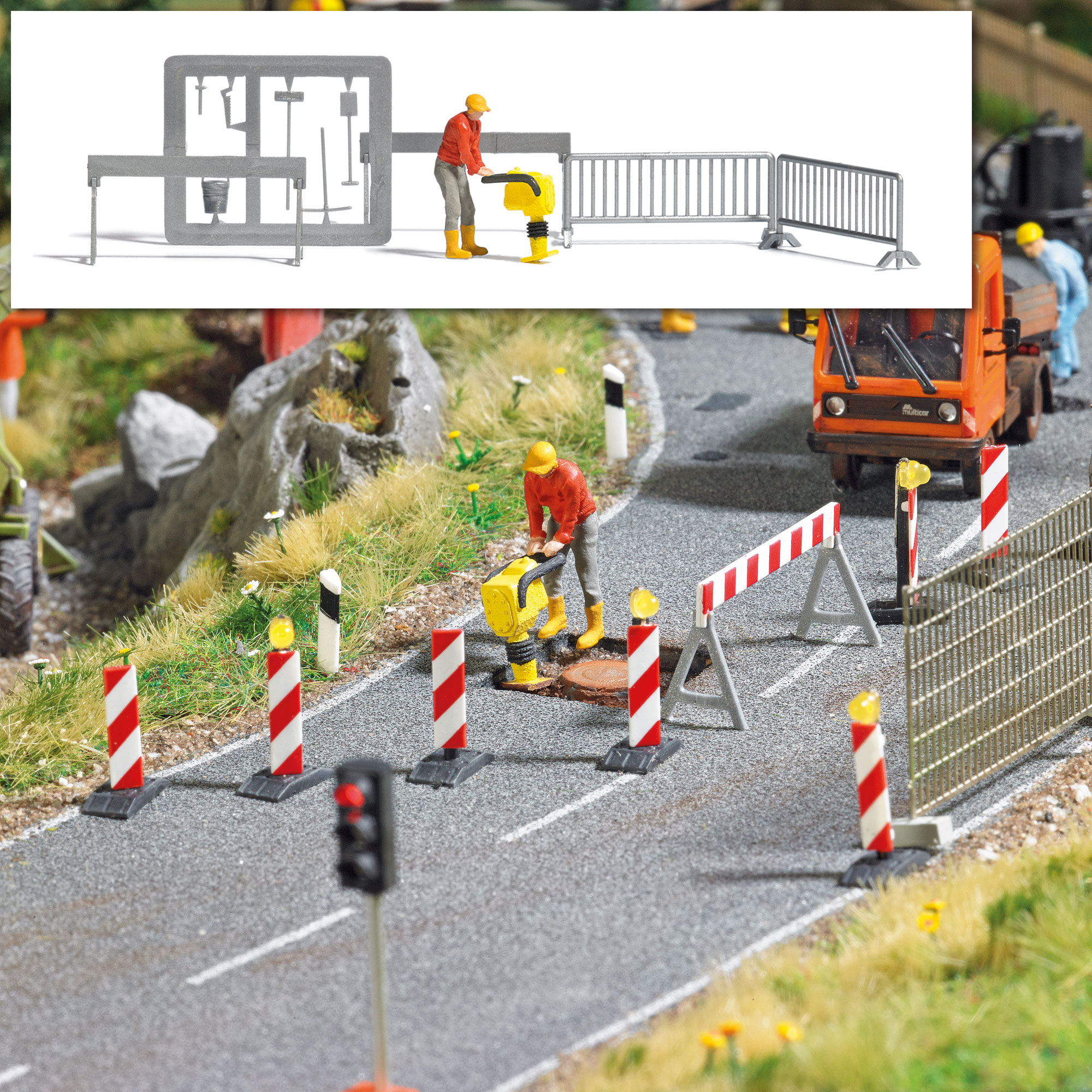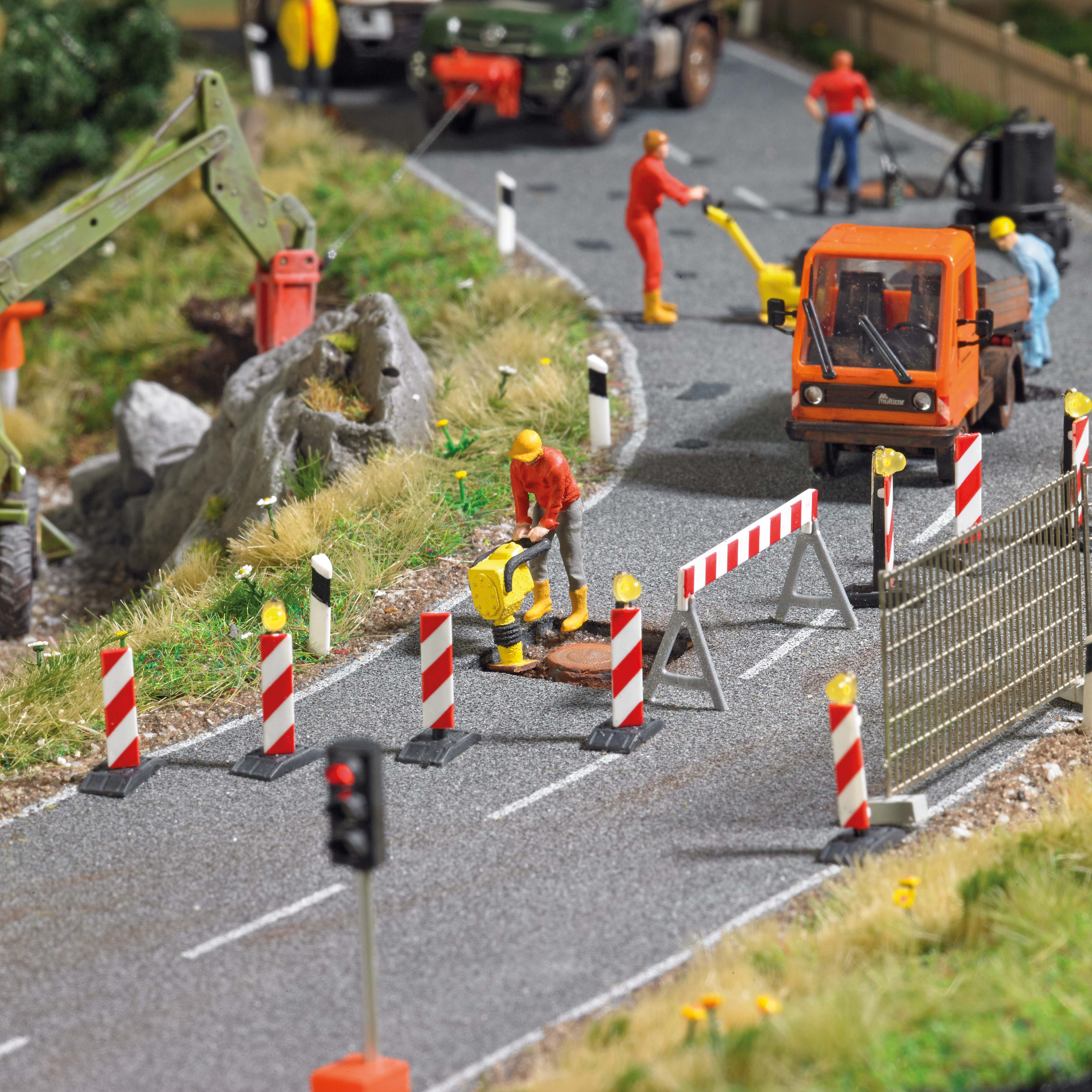 Mit Bauarbeiter, Absperrgitter, Hacke, Schaufel, Besen, Werkzeug und Eimer. Fertigmodell.