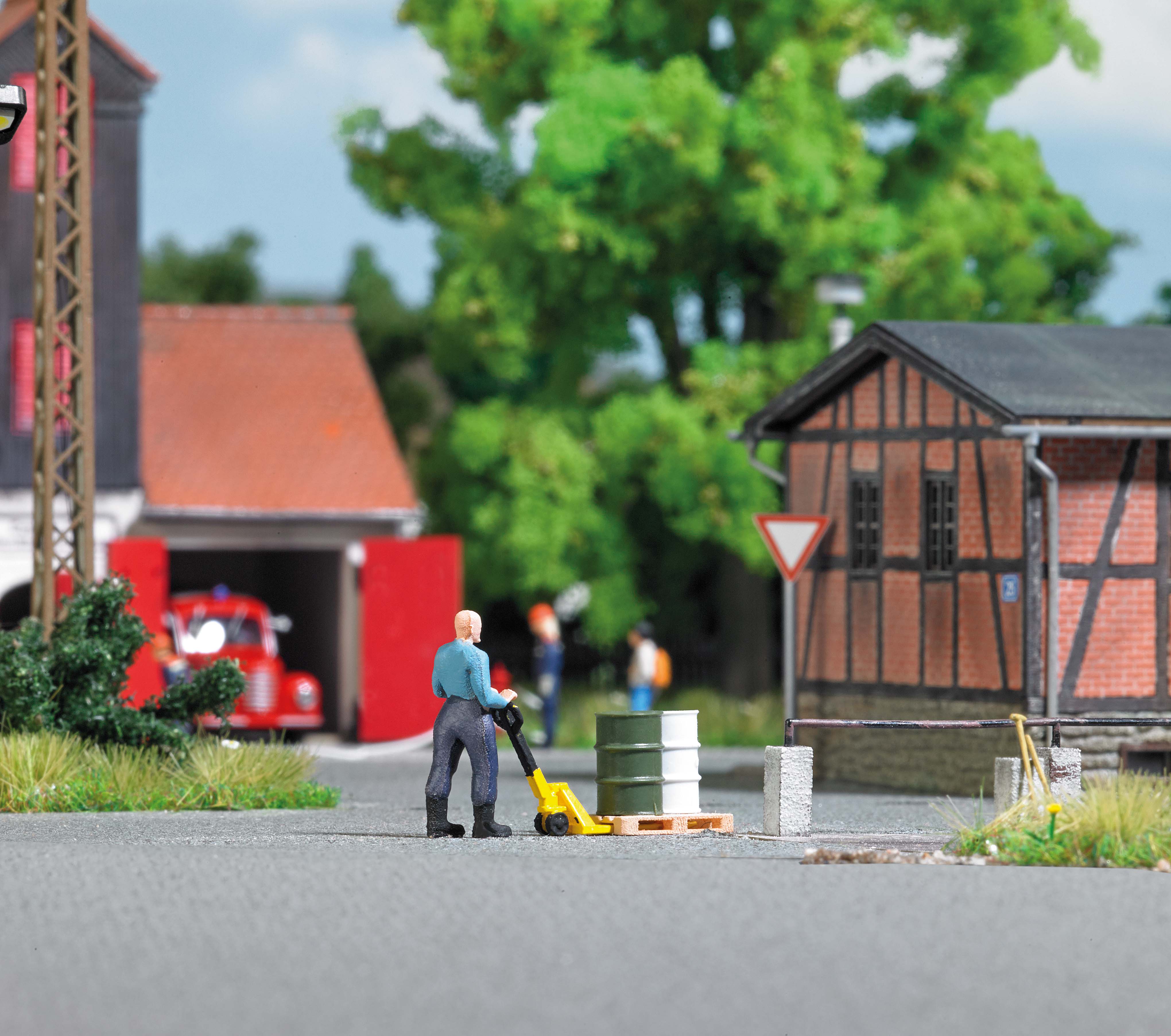 Action Set für die realistische Belebung Ihrer Modellwelt. Mittelpunkt ist das vorbildgetreue Modell eines Gerätes oder einer Maschine mit einer Figur in passender Position (bemaltes Fertigmodell) und viel Zubehör.