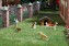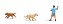Szene einer Apportierübung mit 2 Hunden (einer gehend, einer rennend) sowie Hundehalter, der ein Apportierholz wirft.
