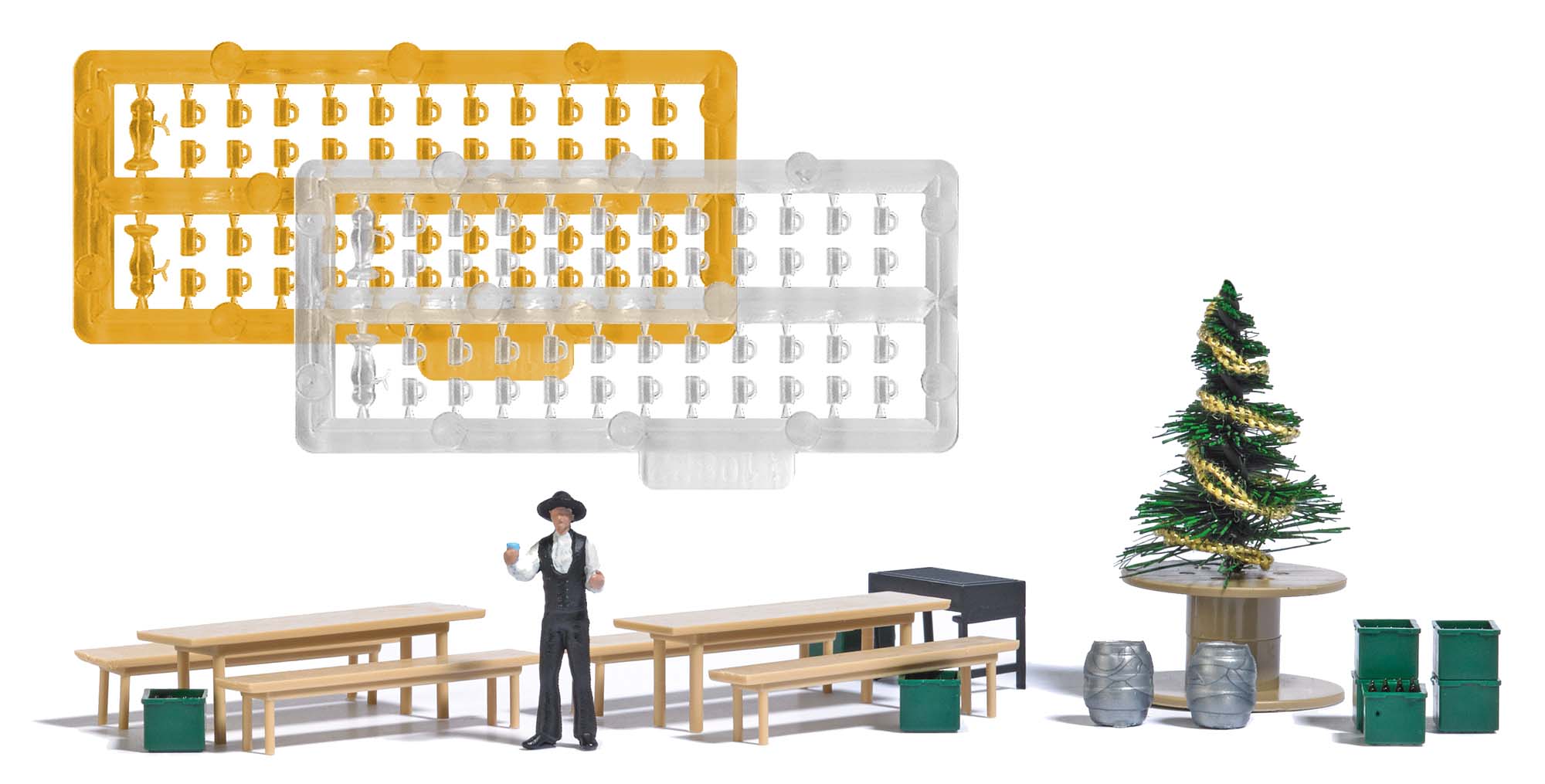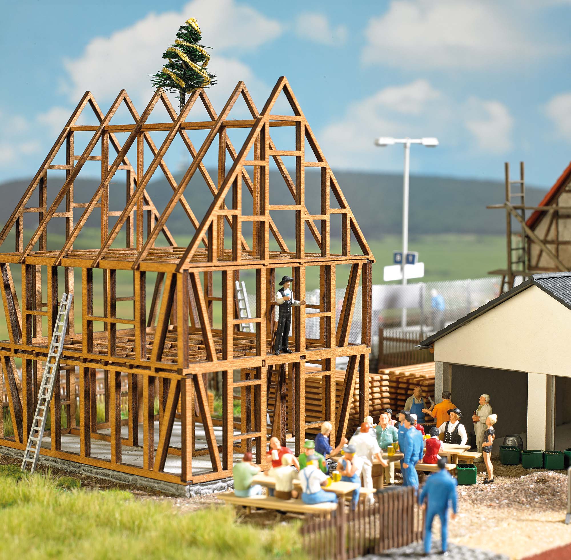 Mit diesem Set kann auf der Modell-Baustelle Richtfest gefeiert werden. Inkl. Zimmermann, Biergarnituren, Grill, Bierfässern und -kisten, Biergläsern und Richtbaum.